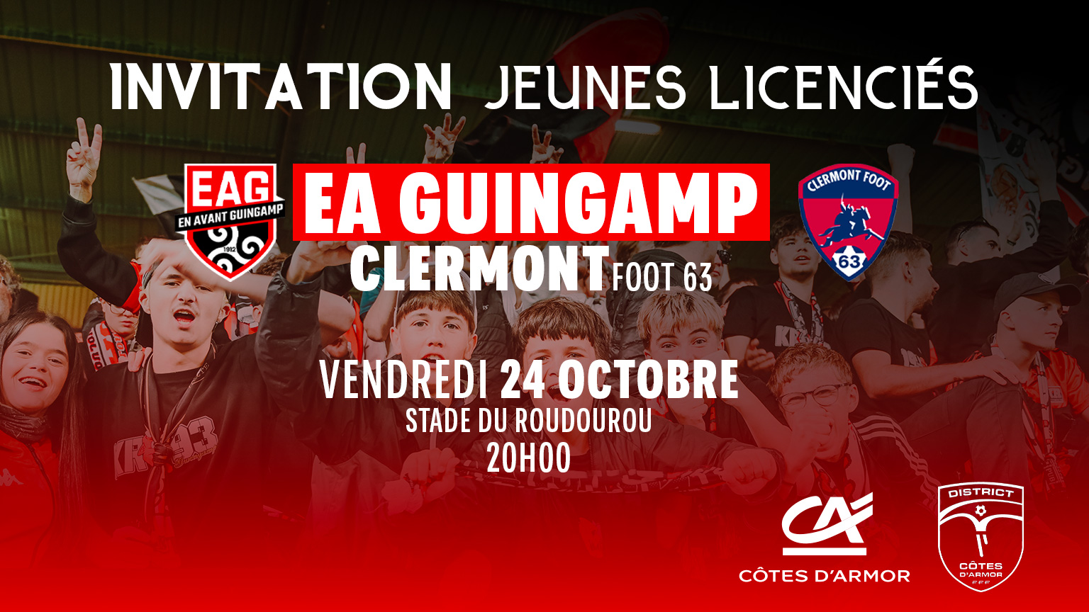 L'ensemble des clubs ont reçu une communication pour inviter les jeunes licenciés au prochain match de l'EA Guingamp au Roudourou le 24 octobre prochain. Bénéficiez de conditions préférentielles pour vos...