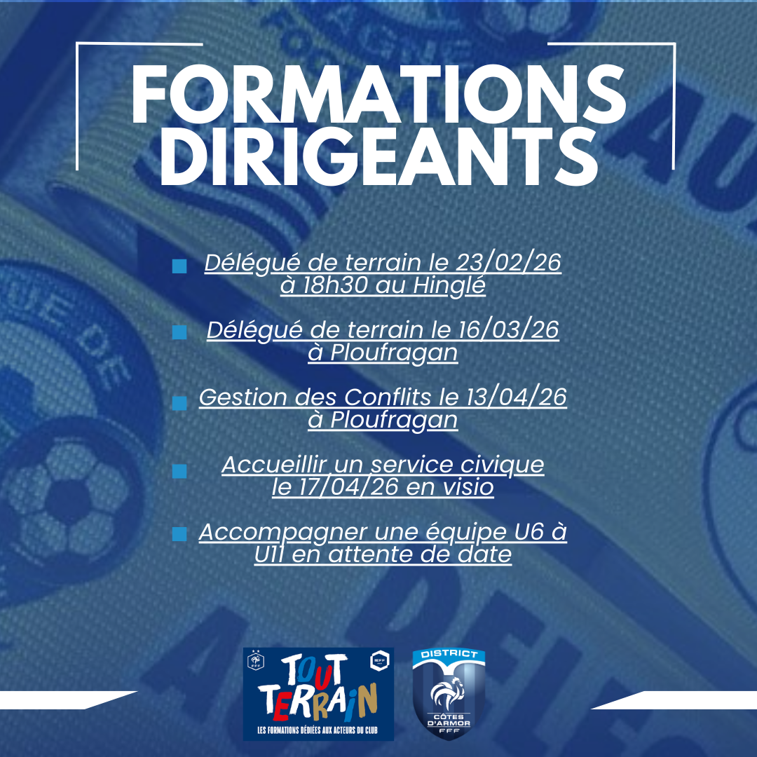 L’ensemble de ces formatons sont ouvertes aux inscriptions via Portailclubs en saisissant l’adresse mail officielle de votre club puis « Formations » – « Tout terrain » – Choisir la thématique souhaitée – « Centre de gestion : Ligue de Bretagne ».