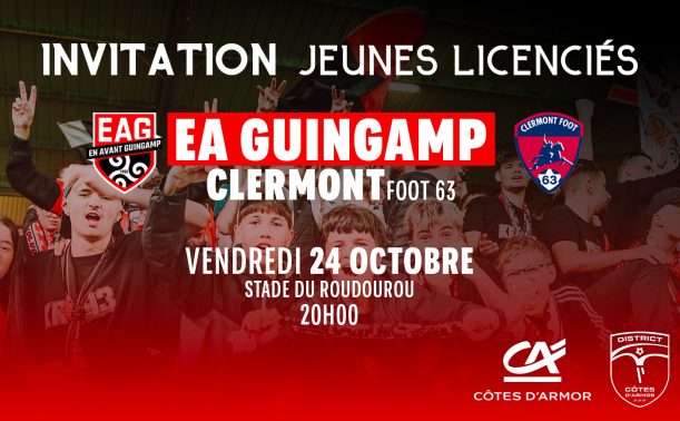 L’ensemble des clubs ont reçu une communication pour inviter les jeunes licenciés au prochain match de l’EA Guingamp au Roudourou le 24 octobre prochain.